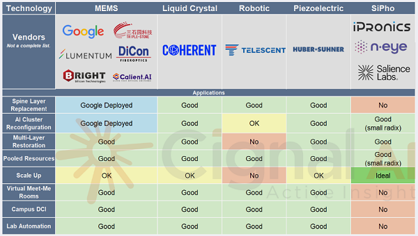 最新報(bào)告指出,數(shù)據(jù)中心內(nèi)的OCS用例已遠(yuǎn)遠(yuǎn)超出谷歌最初的應(yīng)用范圍。運(yùn)營(yíng)商正在實(shí)施和評(píng)估OCS,用于縱向擴(kuò)展(Scale-up)網(wǎng)絡(luò)和后端網(wǎng)絡(luò)、資源池化與解耦,以及園區(qū)數(shù)據(jù)中心互聯(lián),其中可靠性已成為AI級(jí)部署的決定性要求。多種技術(shù)方案——如MEMS(微機(jī)電系統(tǒng))、液晶、壓電、機(jī)器人和硅光子技術(shù)——均旨在滿足不同端口數(shù)、速度和損耗要求的組合。