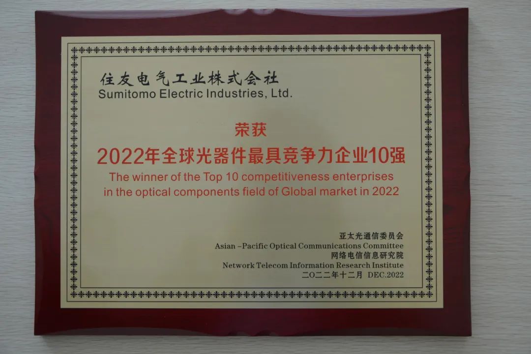 ICC訊 近日,由亞太光通信委員會和網(wǎng)絡電信信息研究院聯(lián)合主辦的《全球|中國光通信最具競爭力企業(yè)10強》評選活動,正式發(fā)布2022年最新十強榜單。住友電工共榮獲: