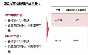 為此,電信籌集的3億元物聯(lián)網(wǎng)專項補(bǔ)貼激勵,在集團(tuán)層面重點(diǎn)支持NB-IoT與CAT1兩大類產(chǎn)品,促進(jìn)產(chǎn)品成熟、產(chǎn)業(yè)成熟的加速;同時針對重點(diǎn)項目,也將以補(bǔ)貼等方式對各省繼續(xù)給予支持和激勵。其中,2億元用于物聯(lián)網(wǎng)重點(diǎn)模塊產(chǎn)品直補(bǔ),包括CAT1單模產(chǎn)品補(bǔ)貼和NB-IoT產(chǎn)品補(bǔ)貼。CAT1單模產(chǎn)品補(bǔ)貼額為40元/模塊,NB-IoT產(chǎn)品補(bǔ)貼額20元/模塊;但是均設(shè)置了在網(wǎng)時長、補(bǔ)貼率等門檻。