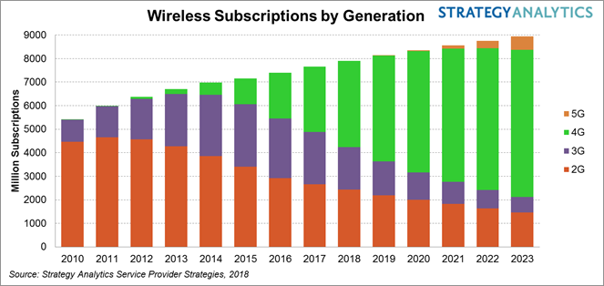 ICCSZ訊 Strategy Analytics電信產(chǎn)業(yè)Strategy Analytics服務(wù)運(yùn)營(yíng)商團(tuán)隊(duì)發(fā)布的最新研究報(bào)告《全球蜂窩用戶預(yù)測(cè)2018-2023》指出,到2023年,無線服務(wù)用戶賬號(hào)將達(dá)到90億,高于現(xiàn)今的77億。報(bào)告預(yù)測(cè),5G的采用將與4G LTE發(fā)展路徑相似;但告誡服務(wù)運(yùn)營(yíng)商,連接性服務(wù)收益增長(zhǎng)將很有限。