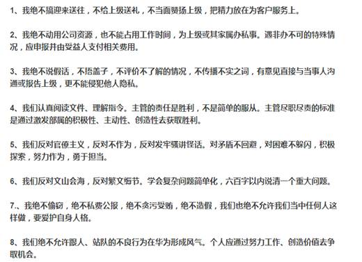 公司培養(yǎng)一個(gè)干部很不容易,常務(wù)董事會(huì)研究處理干部,每次給我匯報(bào)時(shí),我都很痛心。其實(shí)通過努力為公司作出貢獻(xiàn)而獲得的利益更大,華為總體待遇不低,高級干部的待遇收入更高。為了一點(diǎn)小小利益去做不正確的事,不值得!對干部的離任和在任審計(jì),其實(shí)就是在關(guān)懷愛護(hù)干部,讓干部至少不要把壞事做大了。惹大了事,坐牢不舒服,就地司法制度改革后會(huì)更痛苦,國外的牢坐得更不舒服。
