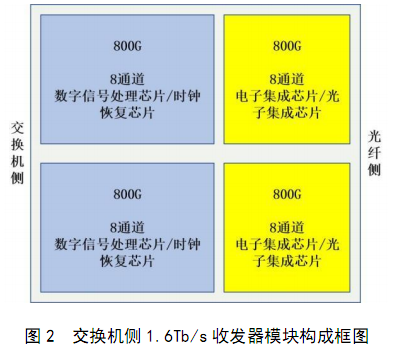 交換機側(cè)1.6Tb/s收發(fā)器模塊與服務(wù)器側(cè)400Gb/s收發(fā)器模塊均包括DSP芯片或CDR芯片、 調(diào)制器驅(qū)動器(Driver)芯片、TIA芯片、光發(fā)射和接收芯片。收發(fā)器模塊使用ELS來提供高光功率光源確保激光器的可靠性。