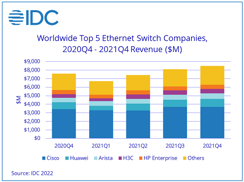 ICC訊(編譯:Nina)根據(jù)IDC發(fā)布的最新報(bào)告,2021年第四季度,全球以太網(wǎng)交換機(jī)市場(chǎng)同比增長(zhǎng)11.8%,收入達(dá)到85億美元;2021年全年市場(chǎng)收入為307億美元,年增9.7%。與此同時(shí),2021年第四季度,全球企業(yè)和服務(wù)提供商(SP)路由器市場(chǎng)同比增長(zhǎng)7.0%,收入達(dá)到46億美元;2021年全年市場(chǎng)收入為159億美元,比2020年增長(zhǎng)6.5%。