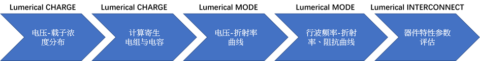 本案例首先以Ansys Lumerical的Multiphysics Charge模塊做電性仿真,項目包含幾種偏壓下參雜硅材料波導的載子濃度分布情況,以及考慮因結構產(chǎn)生的寄生電容、阻抗等特性。接著將結果輸入Lumerical Mode模塊進行接面二極管光纖特征仿真,包含電壓與等校折射率對應曲線,及射頻分析,其中載子濃度與折射率的關系結合Drude (Plasma)與半導體載子濃度模型,詳細請參考文獻2。最后把計算結過作為器件參數(shù),在Lumerical INTERCONNECT接口加入所需器件進行電路仿真,計算相對相移、光傳輸、傳輸線帶寬和眼圖等結果。
