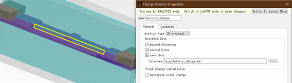 運用模塊內(nèi)完善的半導體材料以及物理模型設定建模后,用穩(wěn)態(tài)設定多個偏壓條件(-0.5~4V,0.5V為間格)進行仿真,并于光路調變范圍設定載子偵測屏,將n載子分布記錄成.mat檔案,準備于步驟3中導入Mode模塊。下圖左圖為本次設定的立體模型,黃框為載子偵測屏的范圍,右圖則為偵測屏設定。