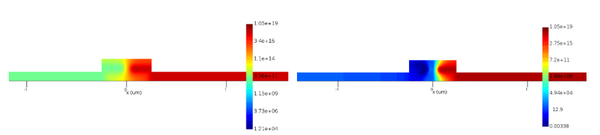 左圖為陽極設定0V陰極設定-0.5V,右圖為陽極設定0V陰極設定1V的n載子分布結果。