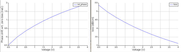 接下來使用Lumerical 的MODE FDE模塊來計算參雜硅材料波導的光學特性。形狀建模后首先用腳本導入步驟1算得的各偏壓下的n載子分布,利用Eigenmode求解器算出波長1.55um下的基本模態(tài)信息,包含等校折射率、群折射率、損耗、及估算有效調變長度為4.5毫米下的相移。這些參數(shù)都將存成.mat于稍后導入到步驟5 INTERCONNECT。