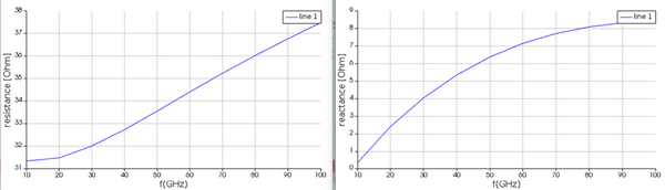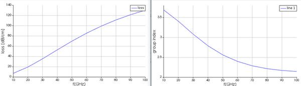 在偏壓為0V的情況下,對頻率10GHz~100GHz,間格為10GHz的每個頻率求解有效折射率和群折射率(其中實部為損耗),再以腳本計算出基本模態(tài)的阻抗(其中實部為電阻,虛部為電抗)。這些結果也存檔成.mat格式用于INTERCONNECT系統(tǒng)仿真中。