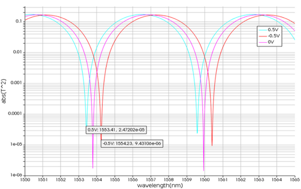 首先以Interconnect中的光網(wǎng)絡分析器(Optical NetworkAnalyzer, ONA)對系統(tǒng)的穿透波進行分析。在ONA源設定仿真波長為1550到1650nm,共1000個波長點,在DC_2分別用-0.5,0,0.5三電壓條件控制行波電極,可以得到不同電壓下穿透率隨波長的變化,從圖可知在控制電壓改變1V時穿透波長差異僅0.8~0.9nm。