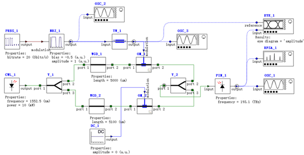 激光功率和波長的選擇是相對任意的,在這種情況下,我們選擇的值在眼睛圖中給出可接受的信噪比,眼圖交叉接近50%,消光比為4.25 dB。