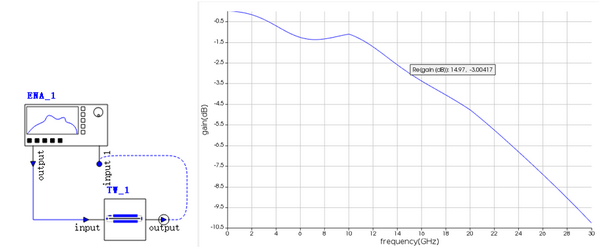 最后以Interconnect中的電網(wǎng)絡分析器(Electrical Network Analyzer ,ENA)對行波電極進行帶寬分析。設定30GHz的頻率范圍,仿真電路如下左圖,而結果如下右圖,3db的帶寬約對應15GHz。