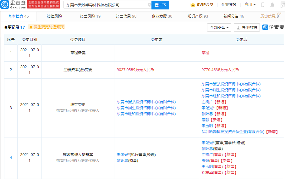 ICC訊 7 月 1 日,東莞市天域半導(dǎo)體科技有限公司發(fā)生工商變更,新增股東華為關(guān)聯(lián)公司深圳哈勃科技投資合伙企業(yè) (有限合伙),同時(shí)公司注冊(cè)資本由約 9027 萬元人民幣增至約 9770 萬元人民幣,增幅超 8%。