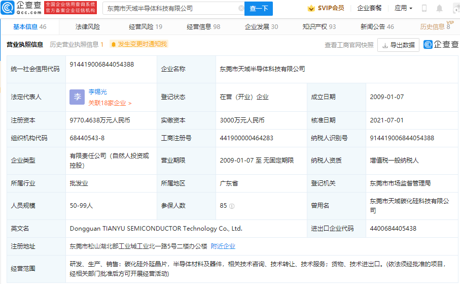 企查查信息顯示,該公司成立于 2009 年,法定代表人為李錫光,經(jīng)營范圍包含:研發(fā)、生產(chǎn)、銷售:碳化硅外延晶片,半導(dǎo)體材料及器件等。