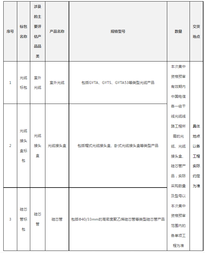 該采購(gòu)羨慕劃分為3個(gè)標(biāo)包,分別為:光纜標(biāo)包、光纜接頭盒標(biāo)包、硅芯管標(biāo)包。其中,光纜標(biāo)包,包括但不限于室外光纜、引入光纜、海底光纜等;光纜接頭盒標(biāo)包,包括但不限于帽式光纜接頭盒、臥式光纜接頭盒等;硅芯管標(biāo)包,包括但不限于Ф40/33mm的高密度聚乙烯硅芯管等。