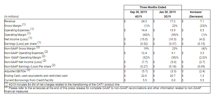 2019財年第四季度,Emcore銷售收入2430萬美元,同比增長1.7%。GAAP毛利率為負(fù)1%,上個財季為22%;非GAAP毛利率19%,上個財季為23%。GAAP來自持續(xù)經(jīng)營業(yè)務(wù)的攤薄稅前EPS為負(fù)的52美分,上個財季為負(fù)的37美分。
