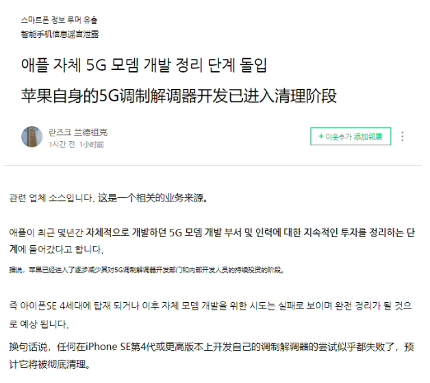 據(jù)韓國門戶網(wǎng)站 Naver 博客上的新聞聚合賬號“yeux1122”運(yùn)營者稱,與蘋果公司 5G 調(diào)制解調(diào)器部門相關(guān)的供應(yīng)鏈消息人士透露,該公司自主研發(fā)調(diào)制解調(diào)器的嘗試迄今都沒有成功,蘋果公司正在結(jié)束這個持續(xù)多年的投資項目。另外,爆料者 @Tech_Reve 也表示,從日本的供應(yīng)鏈消息人士那里聽到了類似的消息。