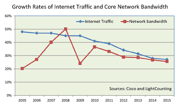 這個(gè)繪制圖揭示的是,在05-06年交通流量增長(zhǎng)和裝機(jī)容量之間存在著明顯的差異:交通流量增長(zhǎng)了35-40%,而密集波分復(fù)用(DWDM)技術(shù)的投資僅增長(zhǎng)20-25%。到了07-08年,這一差距開始縮小。