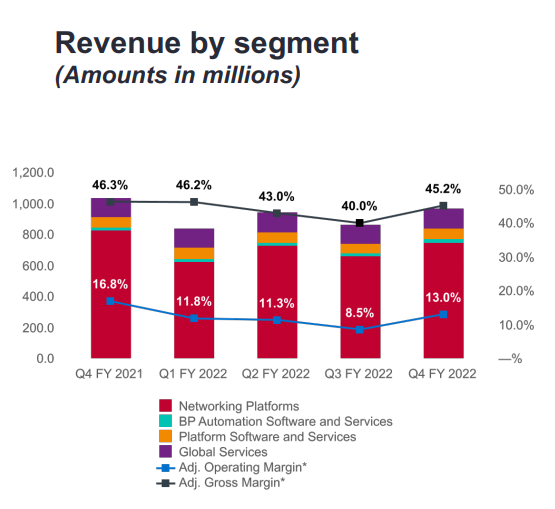 分業(yè)務(wù)部門來看,2022財年第四季度,來自網(wǎng)絡(luò)平臺的銷售收入為7.53億美元,同比下滑9.18%,來自平臺軟件和服務(wù)的銷售收入為7160萬美元,同比增長8.32%,來自全球服務(wù)的銷售收入為1.26億美元,同比下滑1.05%。
