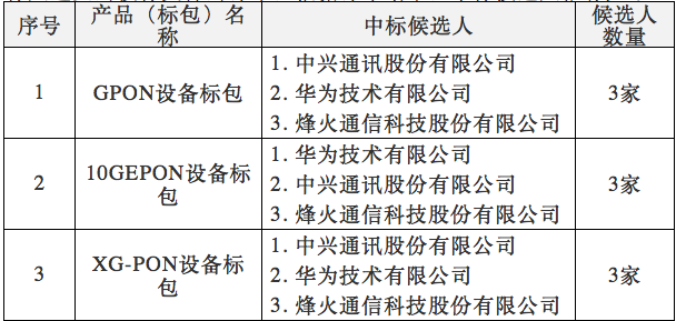 其中,GPON設(shè)備標(biāo)包、10GEPON設(shè)備標(biāo)包、XG-PON設(shè)備標(biāo)包皆是由中興通訊股份有限公司、華為技術(shù)有限公司、烽火通信科技股份有限公司三家廠商共同中標(biāo)。