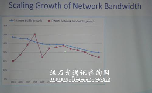 Vladimir Kozlov的講述主要包括網(wǎng)絡(luò)帶寬的規(guī)模增長(zhǎng)趨勢(shì)、全球15大服務(wù)提供商資本開(kāi)支情況、電信設(shè)備商營(yíng)收及利潤(rùn)狀況、由于需求波動(dòng)的影響導(dǎo)致市場(chǎng)的高度非線性、數(shù)據(jù)通信收發(fā)器市場(chǎng)預(yù)測(cè)及10GigE出貨量會(huì)高速增長(zhǎng)等。