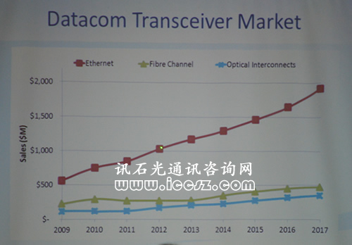 5) 數(shù)據(jù)收發(fā)器市場(chǎng):到2017年,以太網(wǎng)市場(chǎng)銷售額都會(huì)呈高速增長(zhǎng)態(tài)勢(shì),光纖通道市場(chǎng)增長(zhǎng)將緩慢很多,預(yù)計(jì)到2017年大約在5億美元。光互聯(lián)市場(chǎng)最低,到2017年預(yù)計(jì)為4.8億美元。