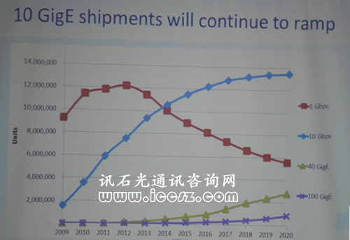 6) 10GigE出貨量會(huì)高速增長(zhǎng):預(yù)計(jì)到2020年,1Gbps將下滑到600萬(wàn)單位以下,10Gbps將上升到接近1400萬(wàn)單位,40GigE將超過(guò)200萬(wàn)單位,100GigE約達(dá)100萬(wàn)單位左右。