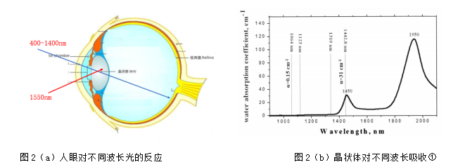 光波長(zhǎng)為1.4μm-2.1μm時(shí),能被人眼晶狀體強(qiáng)烈吸收,無(wú)法達(dá)到視網(wǎng)膜,對(duì)視網(wǎng)膜形成天然保護(hù),從而被稱(chēng)之為人眼安全波長(zhǎng)。反之,光波長(zhǎng)在400nm-1400nm時(shí),人眼晶狀體透過(guò)率大于80%,基本可直達(dá)視網(wǎng)膜,如下圖2(a)所示當(dāng)功率密度達(dá)到一定程度將對(duì)人眼視覺(jué)造成無(wú)法修復(fù)的損傷。