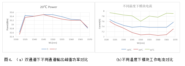 雙通道模塊在不同波長(zhǎng)下輸出功率均有不錯(cuò)表現(xiàn),圖4是使用光譜儀進(jìn)行測(cè)試,評(píng)估輸出峰值功率情況。同時(shí)在不同溫度下功耗也較低,5V供電模塊,在高溫極端情況下滿(mǎn)功率輸出模塊電流不超過(guò)8A。
