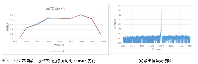 圖5(a)是EDFA模塊在不同輸入波長(zhǎng)下的SMSR優(yōu)化結(jié)果,(b)是實(shí)際輸出信號(hào)光譜圖,可以看出對(duì)雙邊都進(jìn)行了SMSR信噪比優(yōu)化,有效降低了ASE分量噪聲,1532nm波段輸入信號(hào)SMSR可達(dá)到大于26dB,在1569nm波段輸入時(shí)SMSR可以達(dá)到大于31dB,大大提高了放大器模塊的工作帶寬。