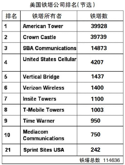 而在鐵塔外包盛行的美國,移動(dòng)通信巨頭Verizon公司今年初再次剝離了鐵塔資產(chǎn),向American Tower公司出售和出租價(jià)值約50億美元的移動(dòng)鐵塔,其中出租超過11300座鐵塔,平均租期為28年,出售165座鐵塔。事實(shí)上,美國絕大部分鐵塔資源長期以來都掌握在鐵塔公司手中。截至今年3月底的最新數(shù)據(jù)顯示,美國最大的移動(dòng)運(yùn)營商Verizon無線只控制1400座鐵塔,在總數(shù)中占比僅為約1.2%,比一年前進(jìn)一步降低了0.2%。美國三大上市鐵塔公司American Tower、Crown Castle和SBA共擁有鐵塔94540座,占美國鐵塔市場約82.5%的份額(見表)。