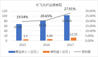 長(zhǎng)飛光纖2015-2017年分別實(shí)現(xiàn)營(yíng)業(yè)收入67.38億元、81.11億元和103.66億元,分別實(shí)現(xiàn)凈利潤(rùn)5.50億元、6.94億元和12.35億元。