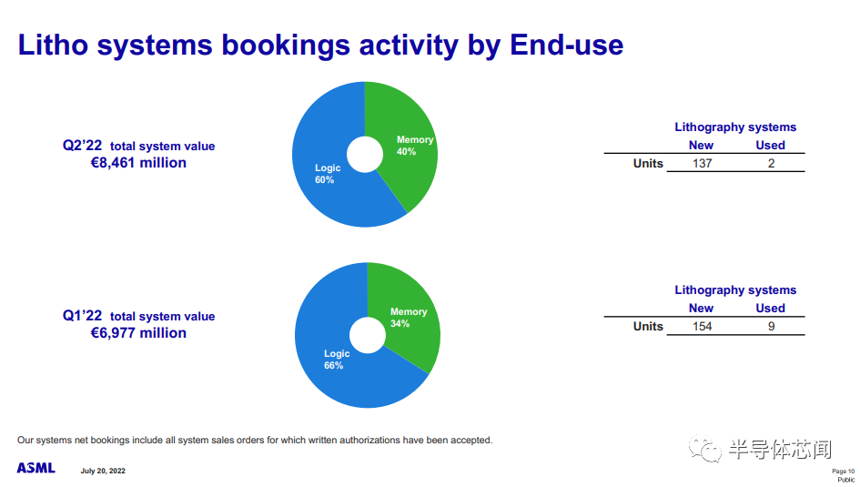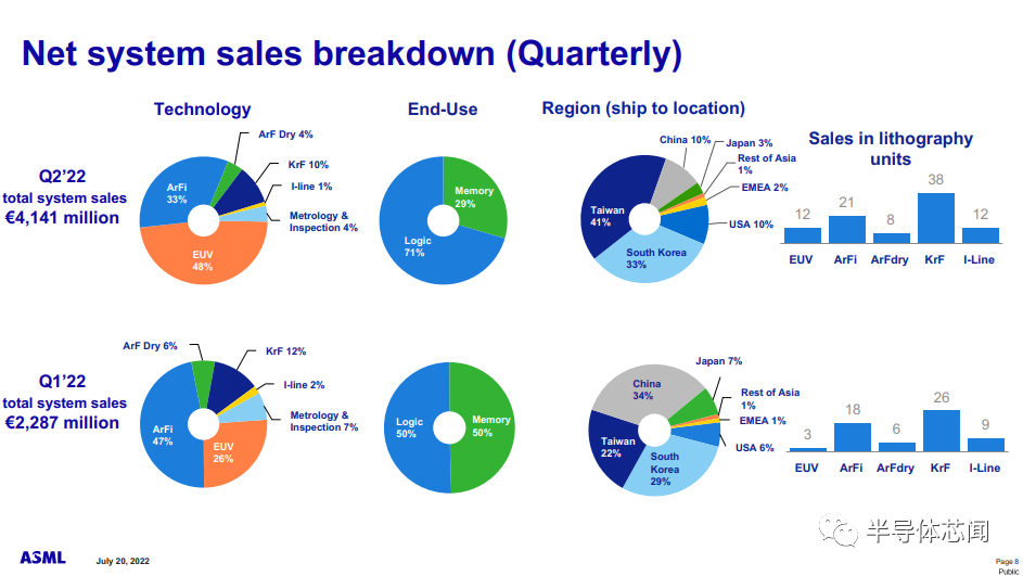 從上圖可以看到,ASML本季度最主要的營收來自中國臺灣,緊隨其后的是韓國,而中國大陸則近居第三。對比第一季度,ASML的最大客戶來源是中國大陸。從出貨的光刻系統(tǒng)可以看到,中間最大的誘因可能是受EUV光刻機訂單的影響。如上圖瑣事,在一季度只有3個EUV設備發(fā)貨,但到了二季度,發(fā)貨了12臺EUV光刻機。考慮到價格因素,我們能夠理解當中的變化。上圖的營收貢獻也說明了同樣的趨勢。在一季度,最大營收貢獻來自ArFi,EUV光刻機僅占26%。但進入二季度,營收貢獻直追50%。
