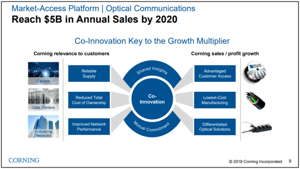 2018年第三季度,康寧來(lái)自光通信部門(mén)的銷(xiāo)售收入為11.17億美元,連續(xù)第二個(gè)季度超過(guò)10億美元,環(huán)比增長(zhǎng)9%,同比增長(zhǎng)22%。光通信部門(mén)凈收入為1.68億美元,環(huán)比增長(zhǎng)12%,同比增長(zhǎng)27%。康寧表示,數(shù)據(jù)中心和運(yùn)營(yíng)商客戶(hù)的強(qiáng)勁需求,以及對(duì)3M通信市場(chǎng)部門(mén)的收購(gòu),推動(dòng)了該季度銷(xiāo)售收入的增長(zhǎng)。康寧還表示,業(yè)務(wù)增長(zhǎng)持續(xù)快于預(yù)期,并向2020年實(shí)現(xiàn)年銷(xiāo)售收入50億美元的目標(biāo)邁進(jìn)一步。