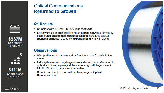 董事長兼首席執(zhí)行官Wendell P. Weeks表示:“2021年我們開端出色。第一季度的成功再次證明了我們已經(jīng)建立了一個更強大、更具彈性的公司。我們相信,憑借這些公司可以保持全年的發(fā)展勢頭?!?