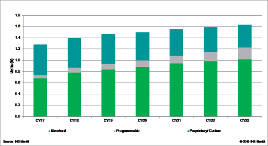 軟件也許確實(shí)正在蠶食這個(gè)市場(chǎng),但硬件不會(huì)不戰(zhàn)而退。隨著數(shù)據(jù)中心交換機(jī)供應(yīng)商減少對(duì)專有/定制芯片的依賴,商用芯片的使用正從白盒供應(yīng)商擴(kuò)展到傳統(tǒng)供應(yīng)商。IHS Markit預(yù)測(cè),數(shù)據(jù)中心以太網(wǎng)交換機(jī)市場(chǎng)中,商用芯片出貨將在2023年達(dá)到所有芯片的62%,高于2018年的56%;與此同時(shí),專有/定制芯片將從2018年的38%下降至25%左右,可編程芯片將從2018年的6%上升至13%。
