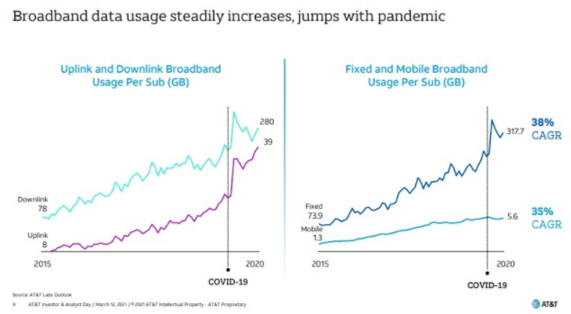 AT&T正尋求擴大光纖覆蓋范圍。在疫情期間,數(shù)據(jù)需求和網(wǎng)絡使用量不斷上升,并且預計短期內(nèi)不會停止。AT&T的數(shù)據(jù)顯示,疫情期間,上下游帶寬數(shù)據(jù)需求大幅上升,其中固定網(wǎng)絡的增長尤為明顯,單用戶的月使用量上升到了317.7G。