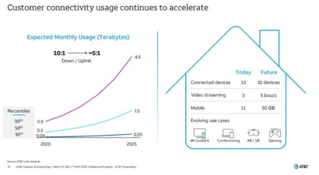 AT&T預計月度數(shù)據(jù)使用量還將繼續(xù)攀升。到2025年,中級用戶的使用量預計將上升至每月1.5T。該運營商還發(fā)現(xiàn),數(shù)據(jù)需求將變得越來越對稱,下行與上行的比例將從目前的10:1上升至2025年的5:1左右。