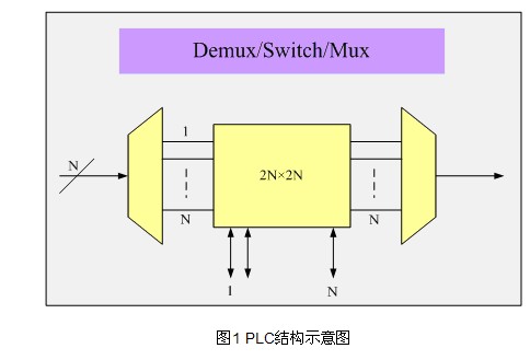平面光波電路ROADM是一種基于硅工藝的集成電路,可以集成多種器件,如光柵、分路器以及光開關(guān)等。它通過集成的陣列光波導(dǎo)(AWG)實(shí)現(xiàn)波長復(fù)用和解復(fù)用,集成的光開關(guān)實(shí)現(xiàn)波長直通或阻斷并加入(Block-and-Add),可變光衰耗器(VOA)實(shí)現(xiàn)每通道的光功率動(dòng)態(tài)均衡。PLC ROADM上下路的通道是彩色光,這意味著只有預(yù)定義的彩色波長可以在每個(gè)端口上下,并可配合可調(diào)濾波器和可調(diào)激光器使用。由于PLC的集成特性,使其成為低成本的ROADM解決方案之一。圖1所示為PLC的結(jié)構(gòu)示意圖。