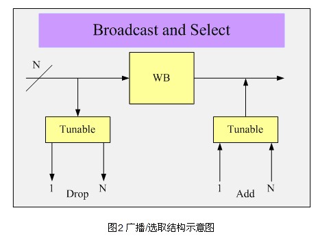 波長阻斷器用阻斷下路波長通過來實(shí)現(xiàn)功能,它可以支持較多的光通道數(shù)和較小的通道間隔,具有較低的色散,并可實(shí)現(xiàn)多個(gè)器件的級(jí)聯(lián),易于實(shí)現(xiàn)光譜均衡。但波長阻斷器需要額外的上下路模塊來構(gòu)建系統(tǒng),上下路配合可調(diào)濾波器和可調(diào)激光器。從本質(zhì)上講,WB是一個(gè)二維器件,通常在構(gòu)建系統(tǒng)中由多個(gè)分立器件構(gòu)成,體積較大,但可以支持100GHz和50GHz的波道間隔,并且技術(shù)成熟,成本較低,因此適合用于LH和ULH系統(tǒng)。圖2所示的是廣播/選取結(jié)構(gòu)示意圖。