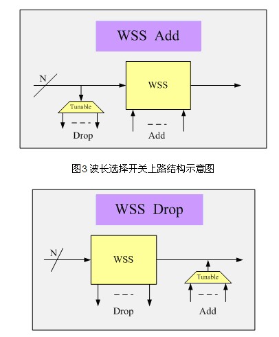 波長選擇交換器(WSS)是近年來發(fā)展迅速的ROADM子系統(tǒng)技術(shù)。WSS基于MEMS光學(xué)平臺(tái),具有頻帶寬、色散低,并且同時(shí)支持10/40Gbit/s光信號(hào)的特點(diǎn)和內(nèi)在的基于端口的波長定義(Colorless)特性。采用自由空間光交換技術(shù),上下路波數(shù)少,但可以支持更高的維度,集成的部件較多,控制復(fù)雜?;赪SS的ROADM逐漸成為4度以上ROADM的首選技術(shù)。圖3、圖4所示的是波長選擇開關(guān)上下路結(jié)構(gòu)示意圖。