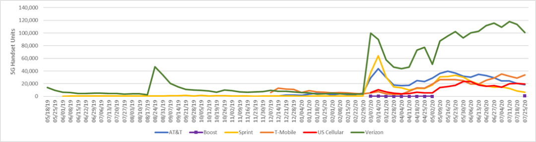 數(shù)據(jù)顯示,到2020年7月中旬,美國市場一共售出410萬部5G手機(jī)。其中,Verizon累計售出約220萬部,AT&T約62.9萬部,T-Mobile約50.1萬部,Sprint約48.3萬部。
