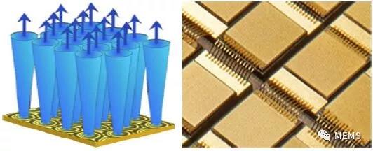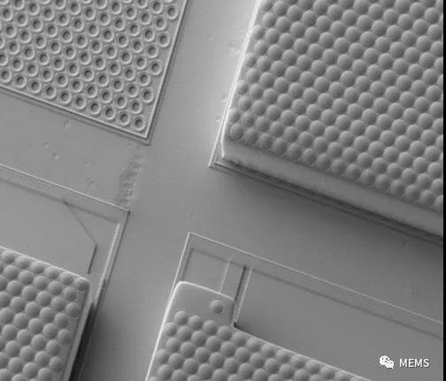 集成微透鏡的VCSEL陣列掃描電鏡(SEM)照片,作為對比,左上方的VCSEL陣列沒有集成微透鏡