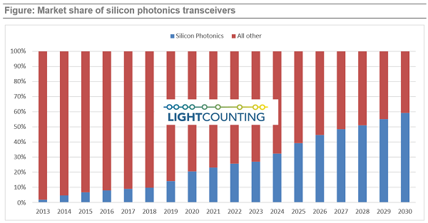 ICC訊 2025年5月,市場研究機(jī)構(gòu)LightCounting發(fā)布報(bào)告稱,盡管硅光技術(shù)優(yōu)勢顯著,但其在光模塊市場的規(guī)?;瘧?yīng)用耗時近十年。Cisco、華為和Intel等公司的決策加速了這一進(jìn)程。報(bào)告預(yù)測,線性驅(qū)動可插拔(LPO)和共封裝光學(xué)(CPO)技術(shù)的普及,將使硅光技術(shù)的市場份額從2025年的30%提升至2030年的60%。Broadcom和NVIDIA等企業(yè)正推動這一轉(zhuǎn)型。