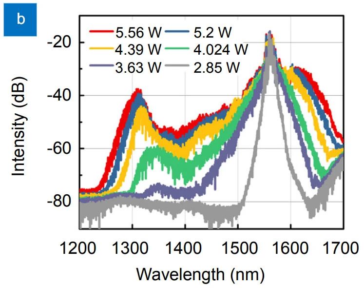 圖1(a)26.5 dBm泵浦功率下產(chǎn)生10 GHz重頻的平坦光頻梳光譜圖;(b)不同功率泵浦下氟碲酸鹽光纖產(chǎn)生中心波長在1310 nm附近的色散波