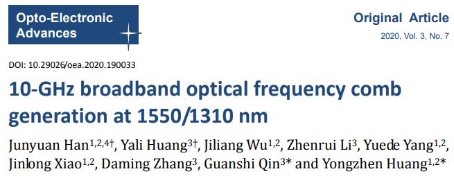 該研究成果以“10-GHz broadband optical frequency comb generation at 1550/1310 nm”為題,作為封底文章發(fā)表在英文期刊 Opto-Electronic Advances 2020年第7期。