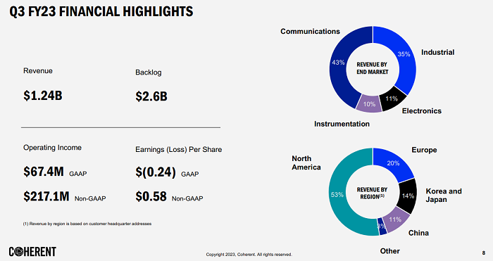 原文:Coherent Corp. Reports Fiscal 2023 Third Quarter Results | Coherent | https://www.coherent.com/news/press-releases/coherent-corp-reports-fiscal-2023-third-quarter-results