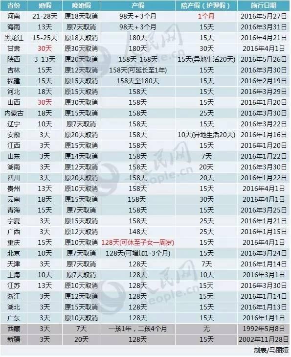 注:西藏、新疆暫未公布新計生條例;重慶規(guī)定可與單位協(xié)商休至子女一周歲,故理論上可休時間最長(排行以實際規(guī)定基礎(chǔ)產(chǎn)假為準)。