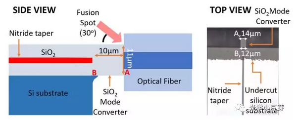 實驗中他們采用的SiN taper作為耦合器,光場從SiN波導(dǎo)中轉(zhuǎn)換成SiO2懸臂的波導(dǎo)模式,進而再耦合到單模光纖中,其結(jié)構(gòu)示意圖如下圖所示。懸臂凸出部分的長度為10um,寬度從12um變?yōu)?4um。