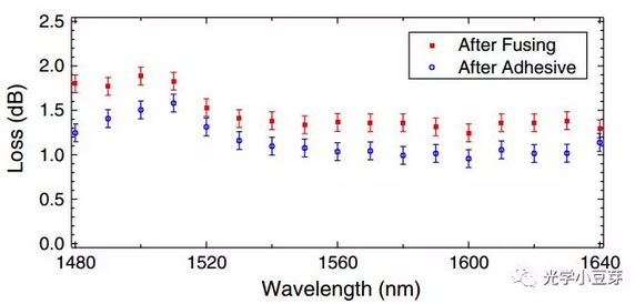 實驗中,他們測得熔接完之后,耦合損耗約為1.3dB, 此時再采用折射率為1.3825的膠水,耦合損耗可降低至1dB,如下圖所示,