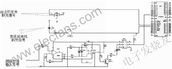 本系統(tǒng)包含一個(gè)主機(jī)和幾個(gè)測(cè)量部件。主機(jī)是系統(tǒng)的核心部分,而測(cè)量部件的數(shù)量取決于實(shí)際測(cè)量的需要(例如在測(cè)量六角圖時(shí),就應(yīng)該是6個(gè)測(cè)量部件),主機(jī)是由MCS-51系列的AT89C51單片機(jī)為主體的部分,外圍電路比較簡(jiǎn)單。它主要依靠一個(gè)光發(fā)射器和一個(gè)光接收器構(gòu)成通信接口,單片機(jī)的輸出端經(jīng)過反相器驅(qū)動(dòng)以后控制光發(fā)射器向測(cè)量部件發(fā)出調(diào)制光信號(hào)。而單片機(jī)的輸入直接與光接收器相連,光接收器把測(cè)量部件發(fā)來的調(diào)制光信號(hào)進(jìn)行解調(diào),單片機(jī)則可以通過程序識(shí)別編碼信號(hào)。光發(fā)射器主要用來啟動(dòng)測(cè)量過程,而光接收器則實(shí)現(xiàn)主機(jī)與測(cè)量部件之間的數(shù)據(jù)通信。